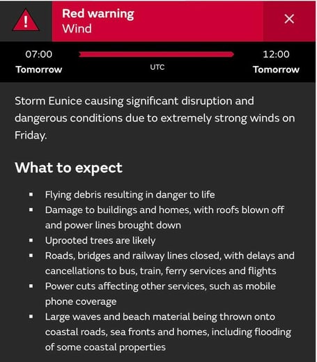 A spokesperson for the Trust said: ’Due to the potential impact of Storm Eunice, and in line with the Red Weather Warning advice issued by the Met Office, we have taken the precautionary decision to close all our schools tomorrow.
